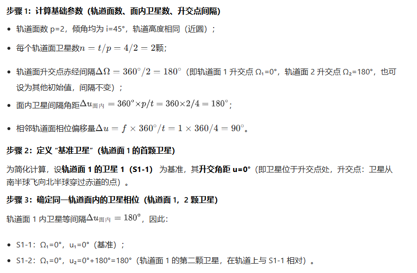 | Walker Delta(最常见) | 相位因子 f≠ 0 ,卫星呈“交错”分布 | 通信、互联网(如 Starlink) |