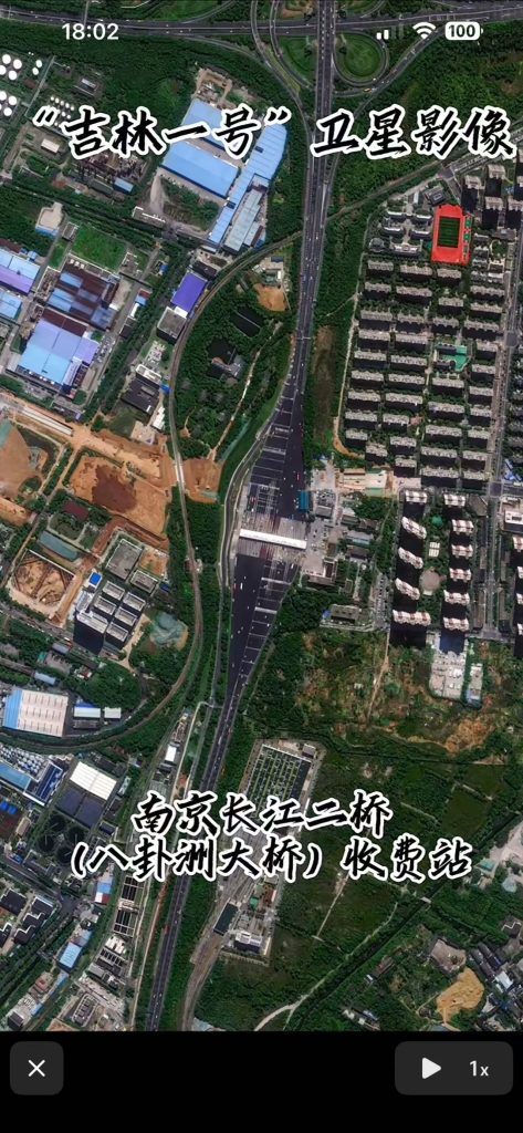 这张 “吉林一号” 拍摄的南京长江二桥收费站影像,是由全色相机 + 多光谱相机共同完成的,最终呈现的是两者融合后的高分辨率彩色影像。
