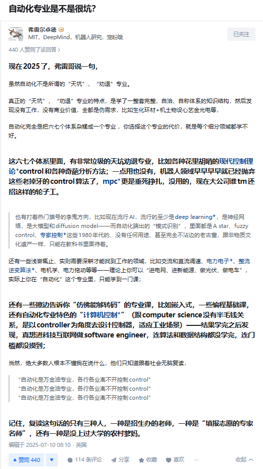 我现在的谋生技能和我大学的专业关系不大。我是自动化专业,如果没有大学毕业后的自我教育,我完全干不了现在的编程工作。我大学毕业时的感觉是,专业相关的工作,我啥也干不了。我一度悔恨自己为什么没有好好学习专业知识,把书多看几遍。现在毕业好多年了,我在知乎看到一个关于自动化专业的帖子,这个帖子让我内心的自我怀疑与悔恨少了很多。